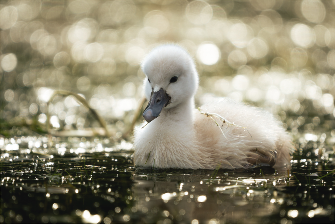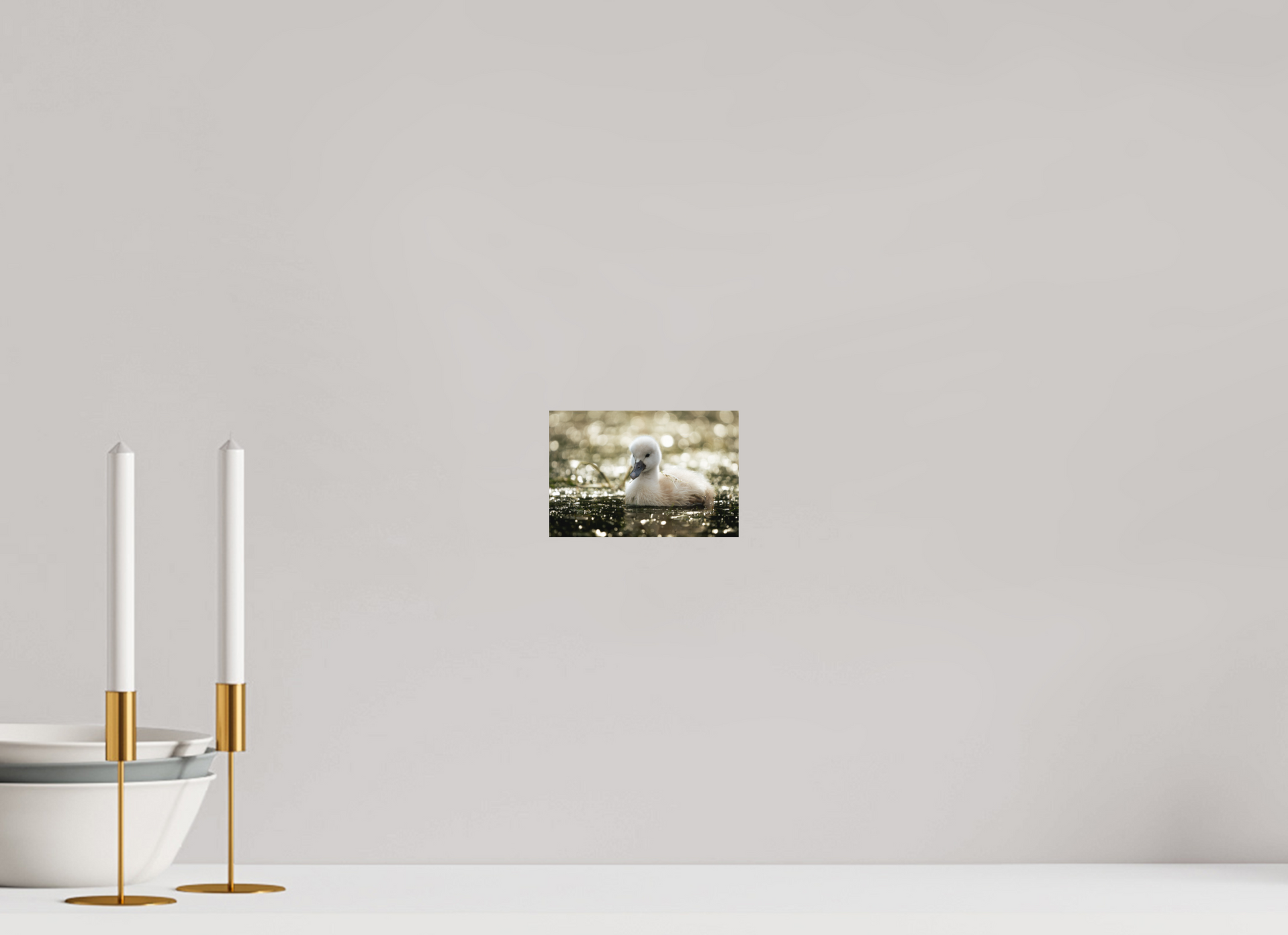 Dans la lumière blanche de l’aurore, un souffle de pureté prend forme sur les eaux calmes. Le cygneau, fragile et encore vêtu de son manteau de duvet, incarne l’espoir des commencements. Autour de lui, les reflets se changent en étoiles liquides, comme si le ciel s’était penché pour bénir son passage.