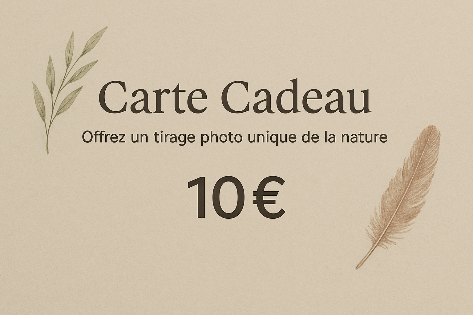 La carte cadeau est le moyen idéal de faire plaisir sans se tromper. Elle permet à vos proches de choisir librement le tirage photo qui leur parle le plus, parmi une collection d’images capturées au plus près du vivant, dans le respect et la discrétion de la nature sauvage ou en fauconnerie.