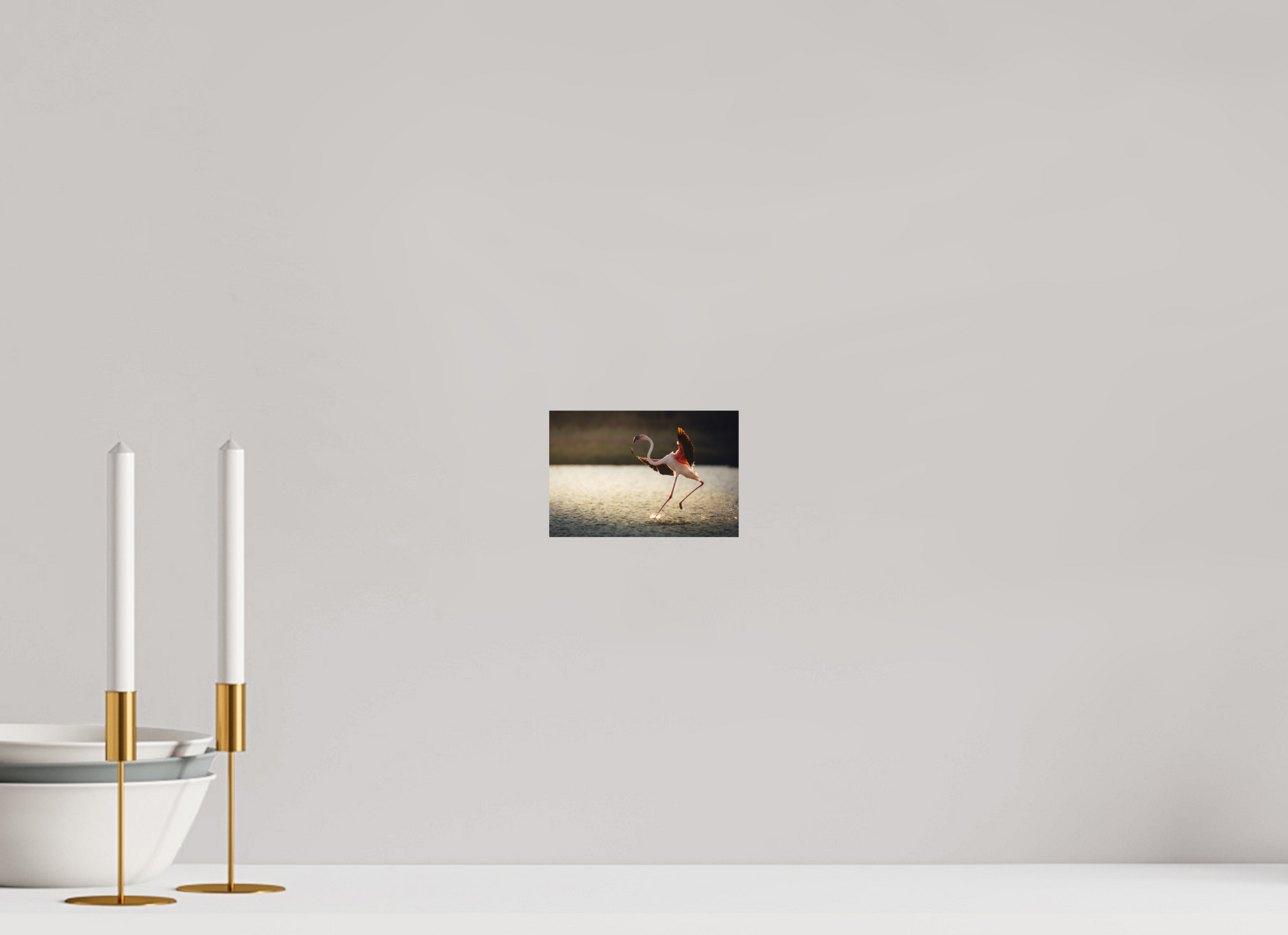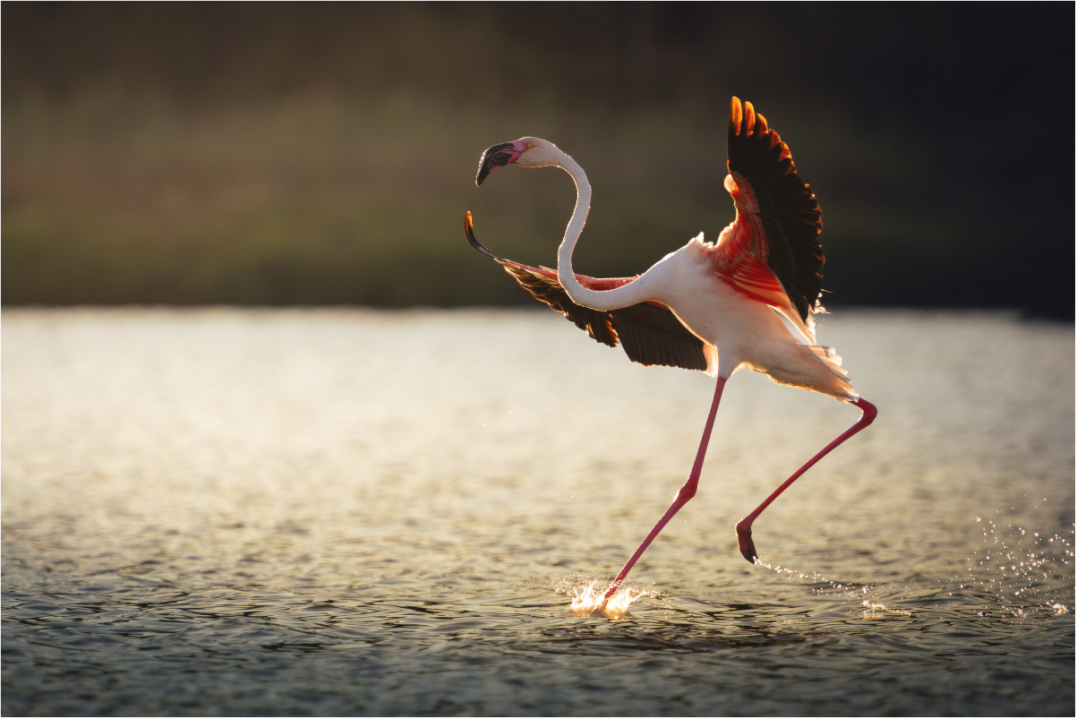 Dans la lueur dorée du couchant, le Flamant s’élève tel un danseur sacré. Ses ailes, noires et incandescentes aux reflets de braise, s’ouvrent comme un manteau de feu, tandis que ses longues jambes effleurent la surface de l’eau avec la légèreté d’un pas céleste.