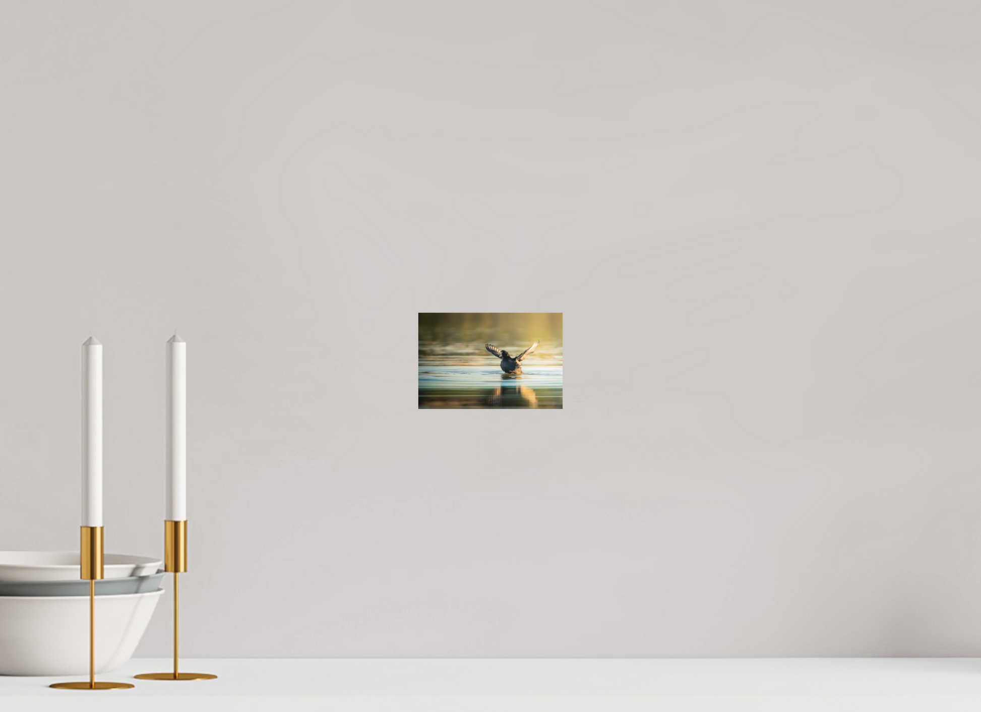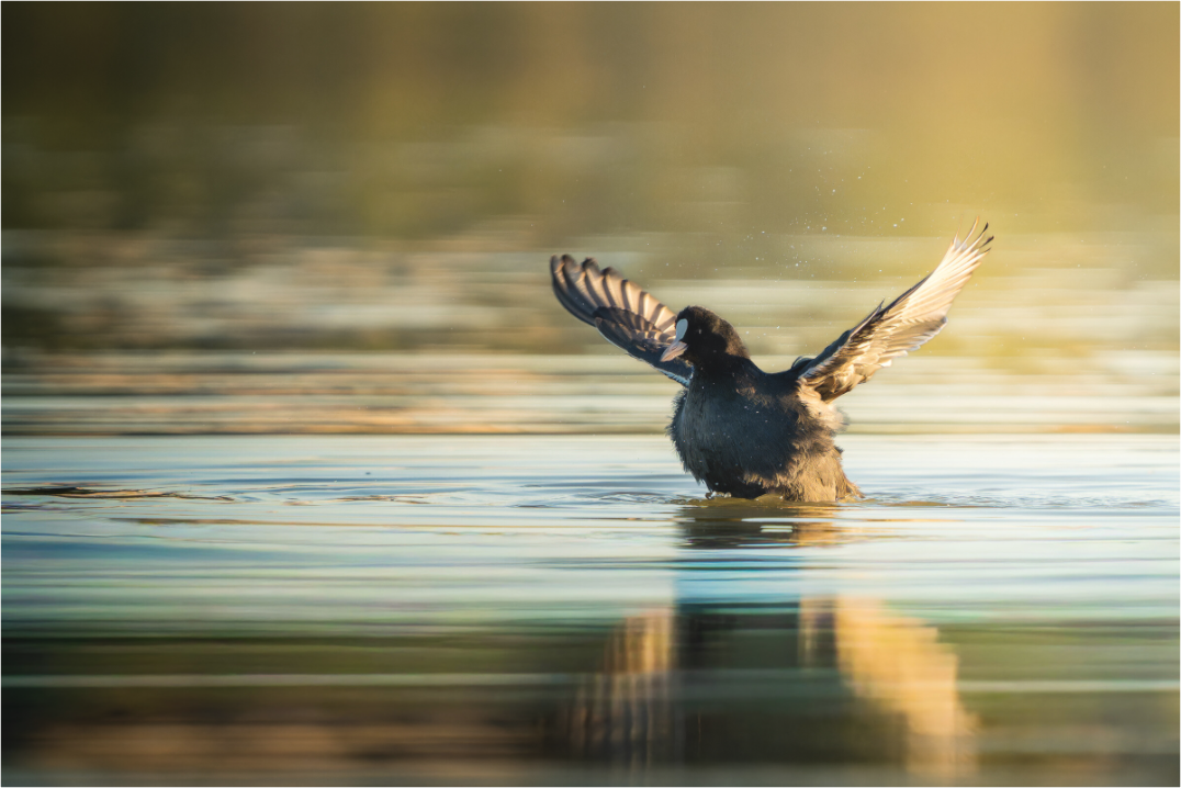 Sous la caresse du soleil levant, la foulque s’élève dans un éclat d’or liquide. Chaque battement d’aile fracture la surface tranquille, projetant l’eau en myriades d’étincelles. Dans ce ballet éphémère, l’ombre de l’oiseau se marie à la lumière, et l’instant se transforme en offrande. C’est une danse sacrée, où la nuit se dissipe et où l’or du jour embrase les ailes sombres, rappelant que même dans la simplicité d’un mouvement, l’univers sait composer ses symphonies les plus lumineuses.