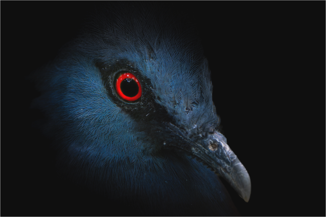 Autour, le plumage bleu nuit s’efface, se dissout comme une brume froide, contrastant avec cette braise éternelle. Ainsi se révèle l’oiseau : à la fois ombre et flamme, gardien du secret minéral et messager du feu primordial.