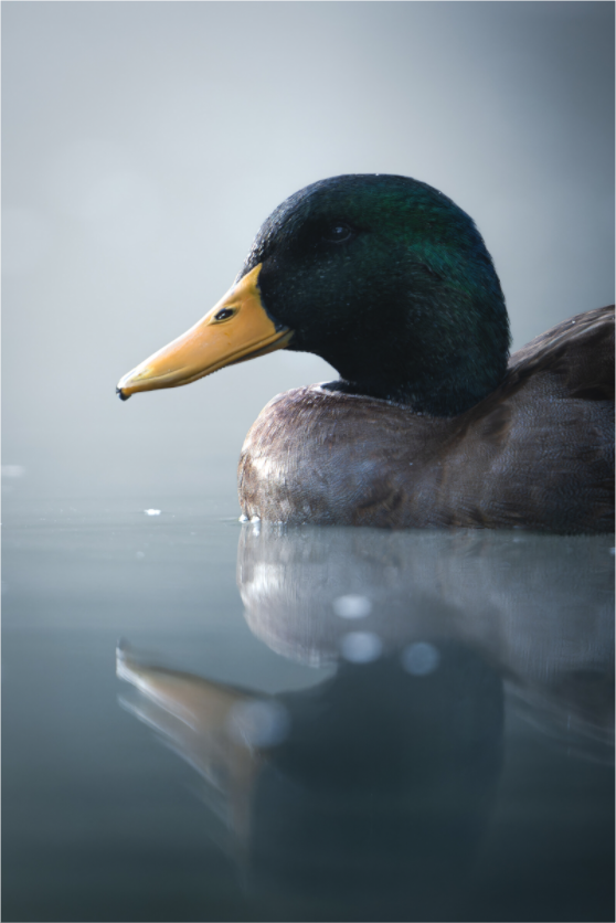 Au cœur des brumes, le colvert avance avec une majesté silencieuse. Son reflet voilé se mêle aux eaux calmes, comme l’ombre d’un monde invisible. Dans cette atmosphère suspendue, il devient l’incarnation même du mystère des étangs. Entre réalité et illusion, il traverse le brouillard tel un messager des brumes, rappelant que la nature abrite encore des apparitions insaisissables.