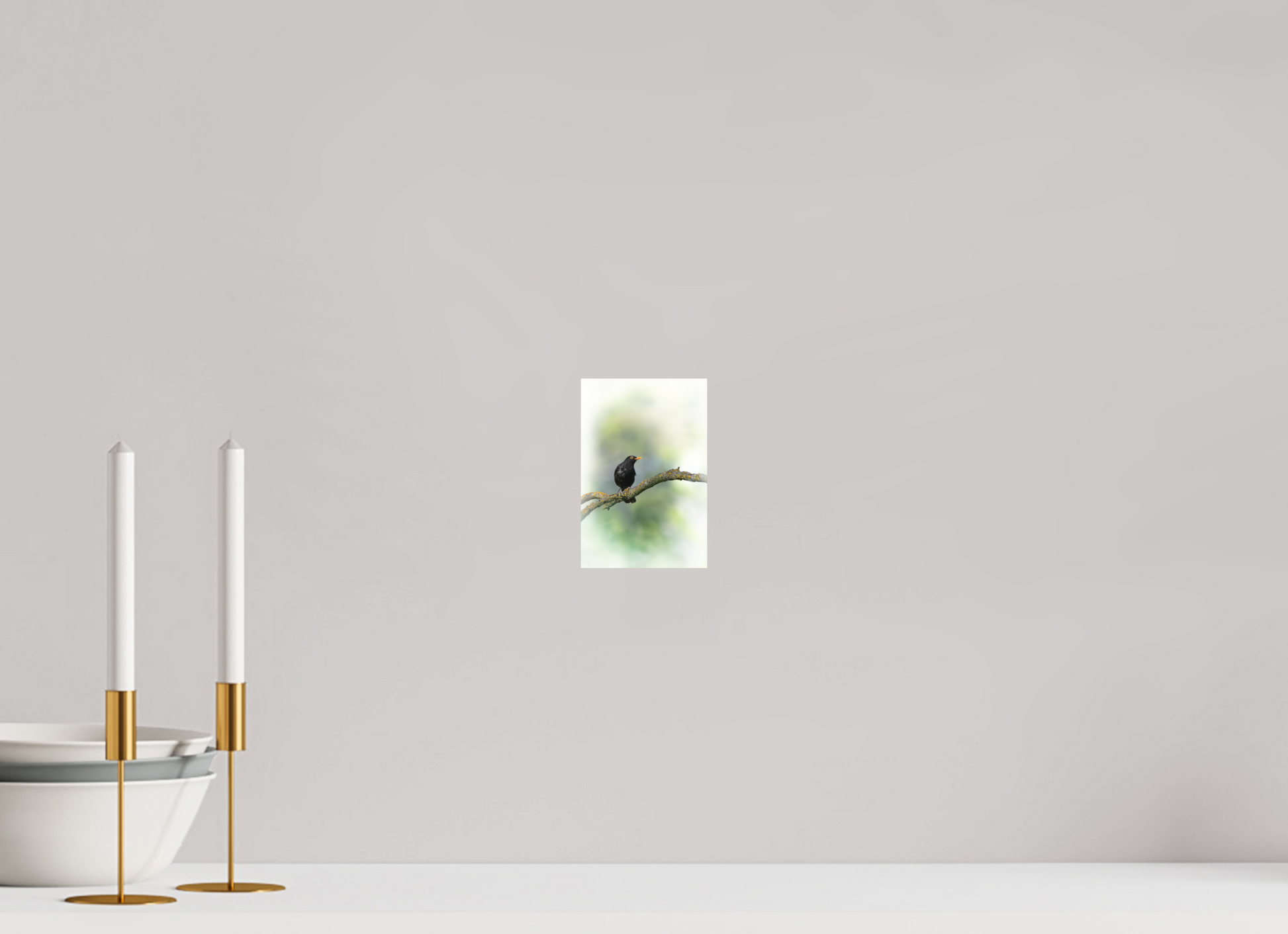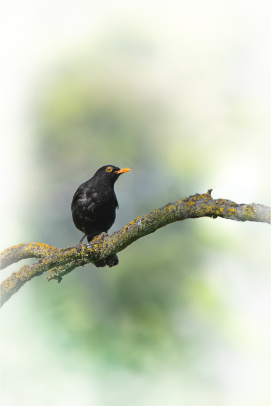 Tel un coup de pinceau échappé de la main d’un peintre invisible, le merle noir se détache sur la toile diffuse des feuillages. Son plumage sombre contraste avec la douceur du fond, comme une encre posée sur un papier immaculé. Il ne chante pas encore, mais déjà sa présence suffit à animer la scène, à transformer une simple branche en œuvre vivante.